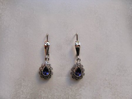 Náušnice bílé zlato, zapínání patent. Kameny 2x ametyst, 20x zirkon. Náušnice vyrábíme s jiným druhem kamenů a ve žlutém zlatě. Velmi atraktivní vzor. Do sady je možno vyrobit závěs, prsten i náhrdelník.