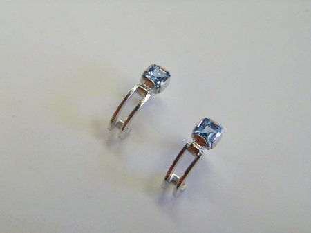náušnice z bílého zlata zapínání na šroubek - povrchová úprava rhodiování - kameny 2x akvamarin čtverec, náušnice jsou prohnuté a kopírují ucho do soupravy vyrábíme i náramek (viz. náramky- NR5)