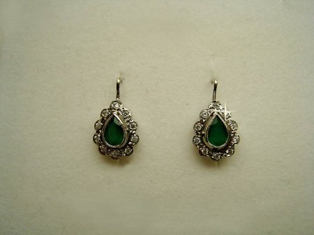 Náušnice bílé zlato, zapínání patent. Povrchová úprava rhodiování. Kameny - 22x zirkon, z toho 2x zelený. Model starožitných náušnic, který je možno osadit smaragdy a brilianty. Do soupravy je možno vyrobit závěs.