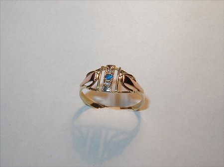 barevná kombinace tří druhů zlata - žluté, červené a bílé ve kterém jsou zasazeny dva zirkony a jeden safír - prsten má ověřený tvar, který nezklame a určitě se bude líbit