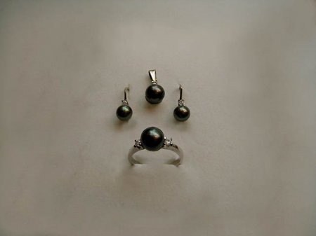 Souprava z bílého zlata - náušnice, závěs, prsten. Náušnice - váha 2,20g zapínání patent, prsten vel. 55, váha 2,90g, závěs váha 1,30g. Kameny zirkony a černé kultivované perly. Tento model vyrábíme i ve žlutém zlatě a jinou barvou perel. Cena je za sadu. Lze objednat i jednotlivě.
