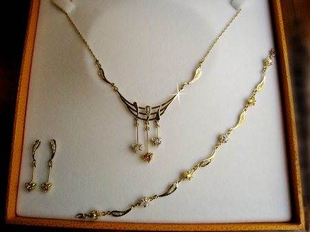 Originální souprava pro nevšední příležitosti ze žlutého zlata. Náhrdelník, visací náušnice a náramek. Náušnice mají zapínání na puzetu. Kameny - bílé a žluté zirkony (40 kusů). Délka náramku je 19 cm. Jednotlivé části soupravy lze objedávat samostatně.