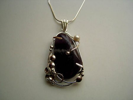 Závěs s ametystem. Stříbro 925/1000. Velikost závěsu je cca. 6,50 x 3,30cm. Šperk doplňuje kultivovaná perla. Originální šperk - ruční práce. Cena je bez řetízku. (možno objednat)