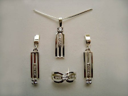Souprava - stříbro ryzost 925/1000 - náušnice, závěs, prsten a řetízek. Prsten 1,80g, velikost 50, náušnice visací - zapínání šroubek, váha 3,60g, závěs 1,60g, řetízek kostičkový 50cm.