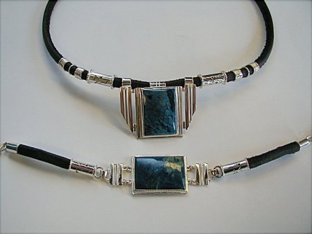 náhrdelník a náramek kombinace stříbro + kůže, kámen napodobenina lapisu lazuri, váha kolem 22g náhrdelník, 18g náramek povrchová úprava stříbření nebo rhodiování každý kus je original, velice efektní vzhled