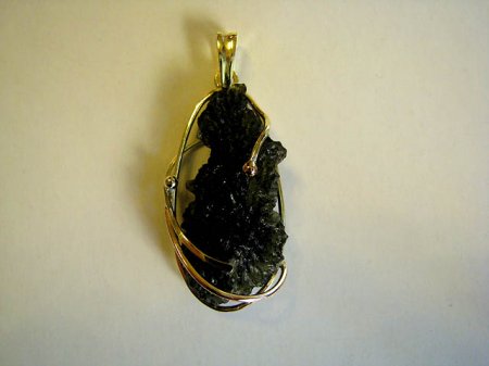 Závěs s vltavínem. Ryzost 585/1000 - kombinace žluté, červené zlato. Výrazný solitérní šperk. Do soupravy vyrábíme náušnice i náramky.