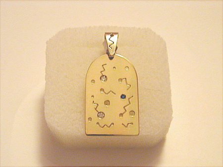 destička zdobená prořezáváním a kameny na našem obrázku je použit 1x safír a 2x zirkon volba kamenů je samozřejmě libovolná, povrchová úprava závěsu může být matová i lesklá
