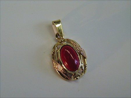 závěs s korálem kombinace žluté a červené zlato které je zdobené rytinou
