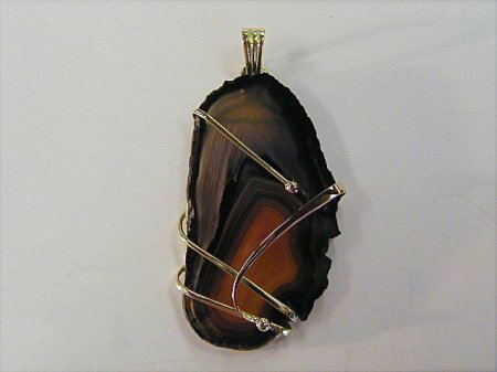 závěs s achátem, kombinace žluté a červené zlato tímto způsobem zpracováváme různé druhy kamenů - vždy se vychází z tvaru daného nerostu - je to rovněž velice výrazný a nepřehlédnutelný model