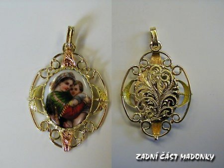 závěs s madonkou, kombinace žluté a červené zlato ryzost 585/1000 rámeček ve stylu filigránu doplňuje bohatá barokní rytina obrázek je porcelánový - ruční práce